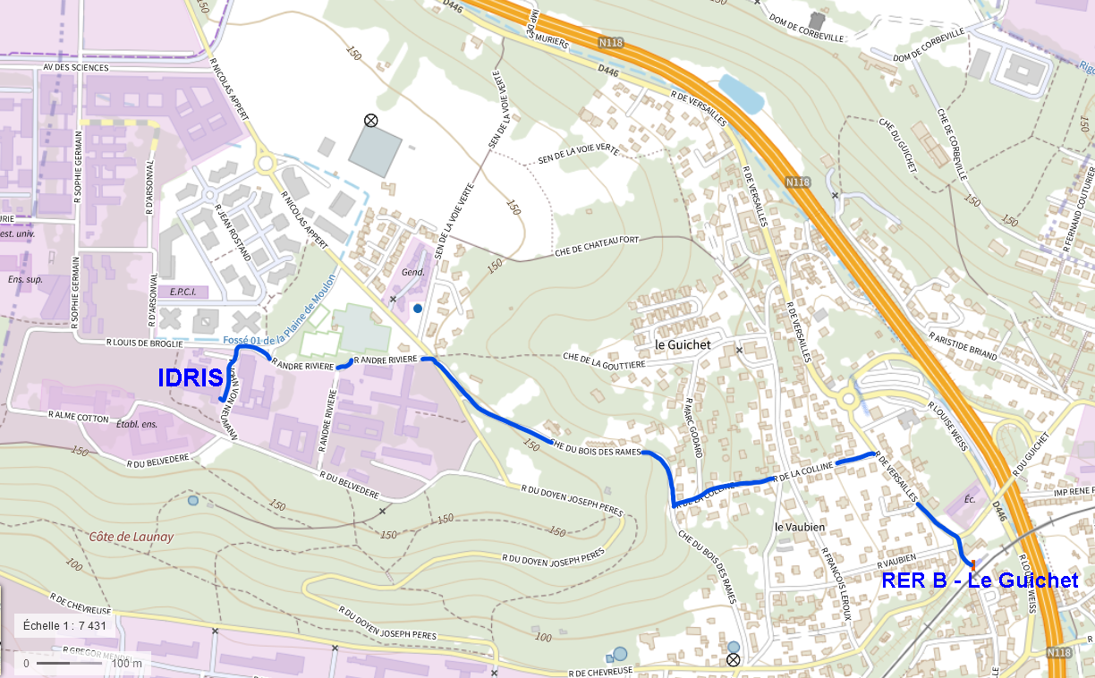 Depuis la gare RER B du Guichet, vous pouvez rejoindre l'IDRIS à pied (dénivelé important) : plan